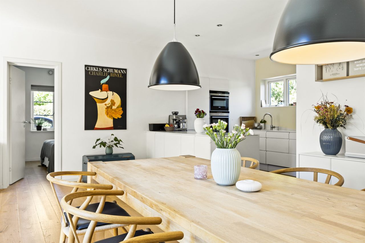 Husets store entré har god opbevaringsplads. Herfra er der 2 store og lyse børneværelser samt et lækkert badeværelse med grå klinker og egetræsbademøbel. Husets hjerterum er det store åbne og lyse køkken-/alrum som ligeledes flyder sammen med dagligstuen. Køkkenet er i hvide grebsløse elementer og med hyggelig køkkenø. Dagligstuen har ligeledes et fantastisk lysindfald og man kan side ugeneret i sofaen og dog stadig være en del af samtalerne i alrummet. Fra stuen er der udgang til skøn fliseterrasse mod sydvest.