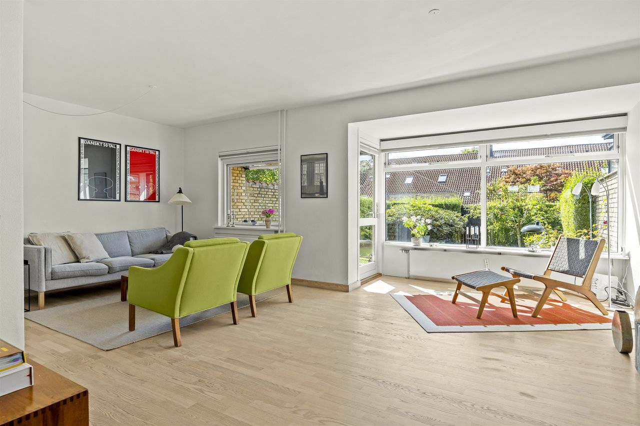Man træder ind i den lyse fordelingsgang. Køkkenet ligger i åben forbindelse med spisestuen og er funktionelt indrettet. Fra køkkenet er der udsigt til Dyrehaven og morgensolens stråler kan nydes. Spisestue og dagligstue en suite har god plads til at familien kan samles om spisebordet og stuen har plads til at indrette flere zoner. Fra stuen er der udgang til den hyggeligste have mod sydvest. Her er der god plads til at nyde de lange og lune sommeraftener. Haven er ugeneret og man har himmel og natur omkring sig.