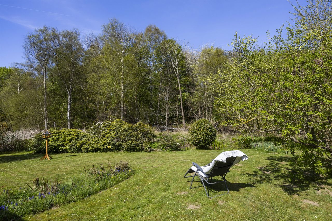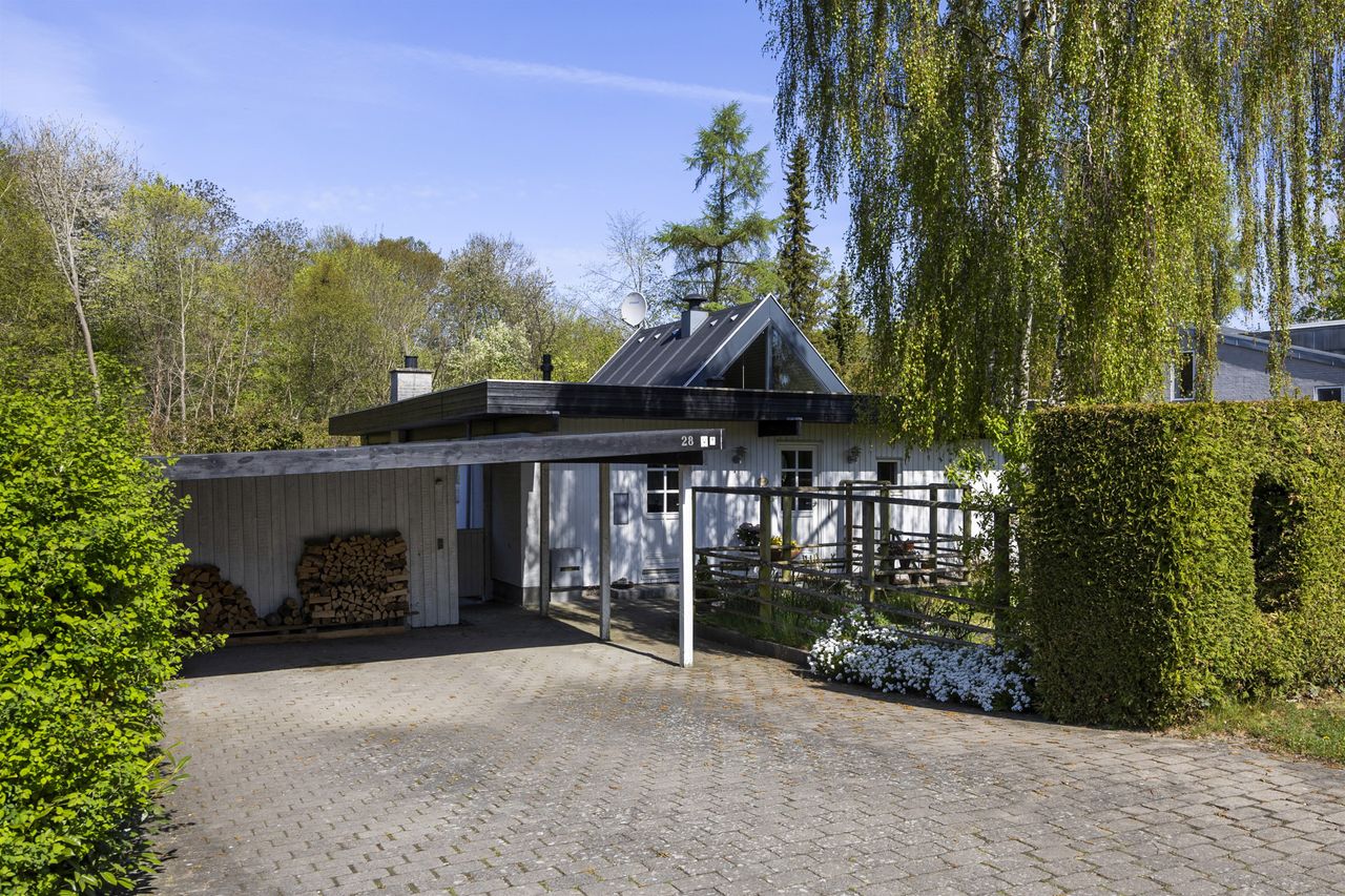 Haven er fuld af fugleliv og skønne farver og Kratmosen nydes ugeneret. Desuden er der stor carport med skur samt drivhus på grunden.