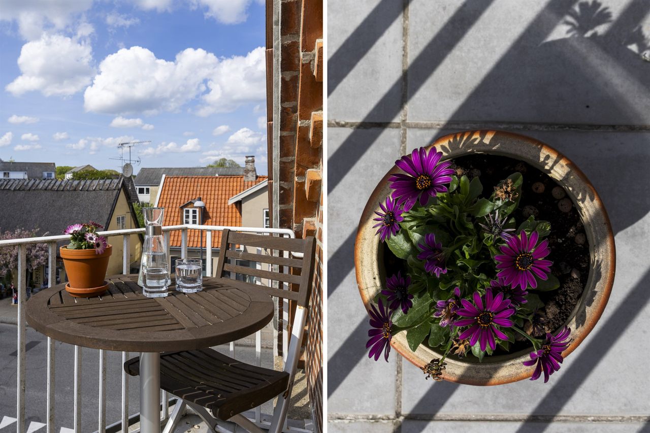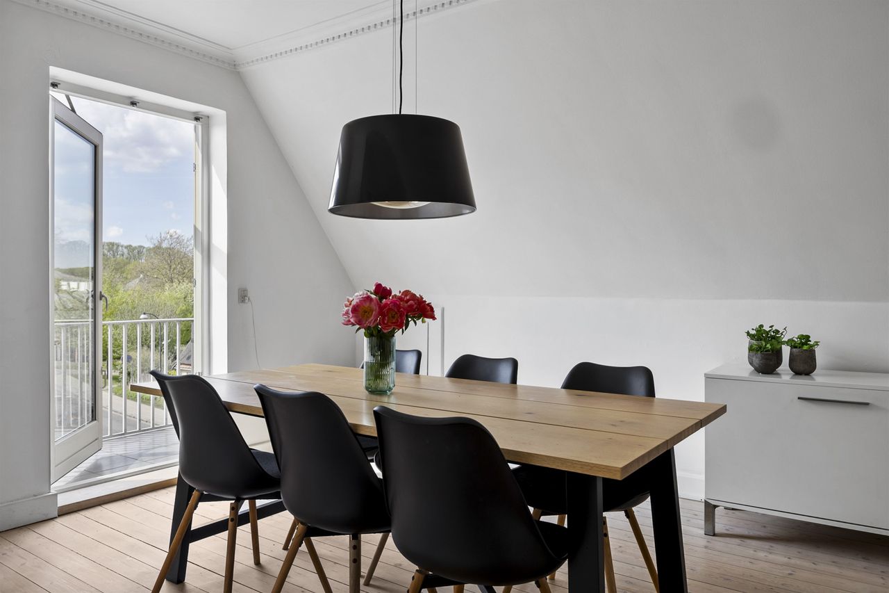 Man træder ind af egen hoveddør, hvor der er plads til overtøjet og herfra svungen trappe op til lejligheden. Her kommer man til repos med fordelingsgang til boligens rum. Mod vest findes et dejligt køkken i hvide elementer og i åben forbindelse med spisestue og dagligstuen. Der er et godt lys og gode indretningsmuligheder. Fra spisestuen er der udgang til altan. Derudover er der 2 fine værelser og et nydeligt badeværelse med brus. Der er nyere tag på ejendommen og lejligheden har brugsret til loftrummet, hvor der er potentiale for yderligere udnyttelse heraf til opbevaring og fx hems eller lign.