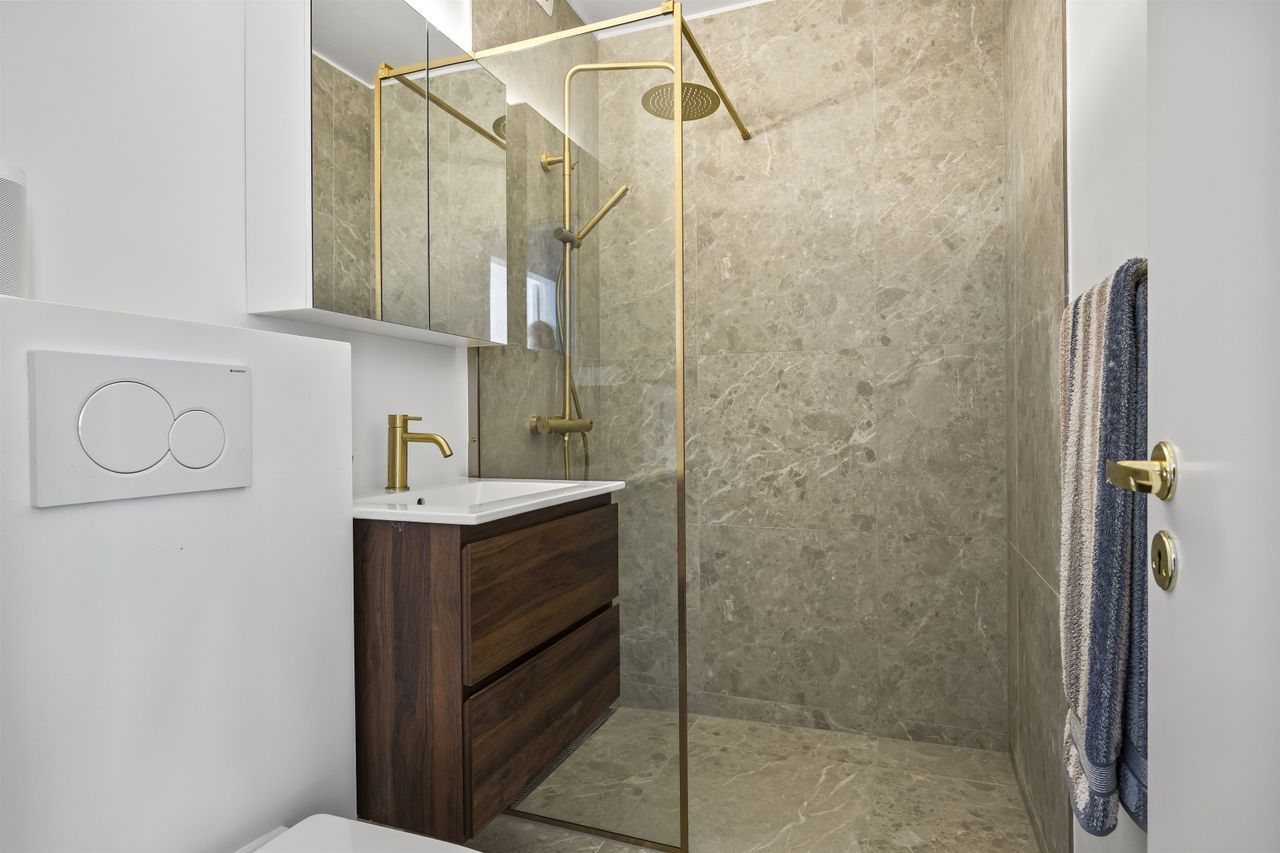 Badeværelset er flot og moderne med separat bruseniche og et stilrent udtryk, hvor materialevalget understøtter den gennemgående kvalitet i boligen.