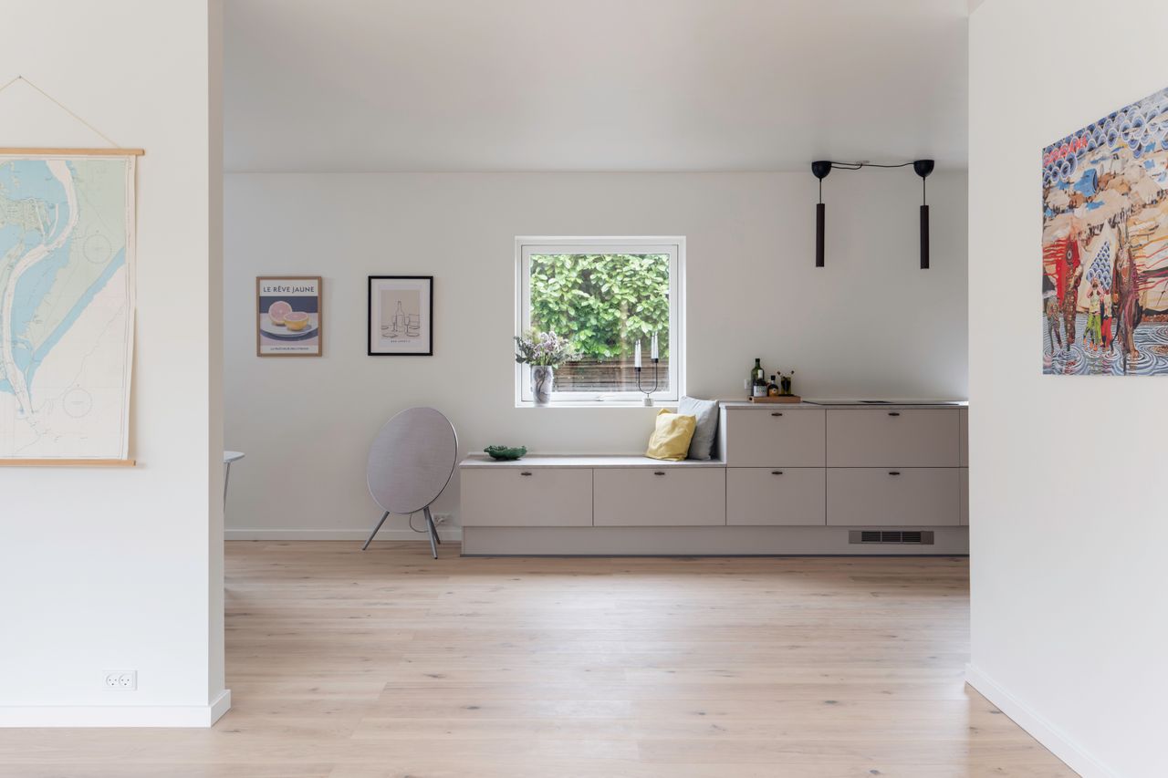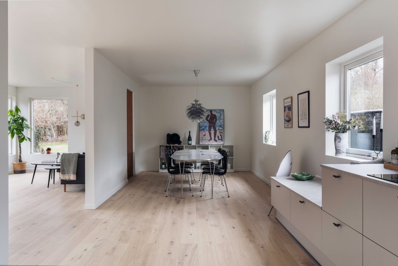 Fra I træder ind i den rummelige fordelingsentré, åbenbares boligens gennemtænkte planløsning. Hjertet i hjemmet er det store køkken-alrum, hvor et stilrent AUBO-køkken smelter sømløst sammen med en lys og luftig spisestue samt en hyggelig opholdsstue med mange og store vinduer mod haven, et samlingspunkt, hvor hverdagen leves og gæsterne samles.